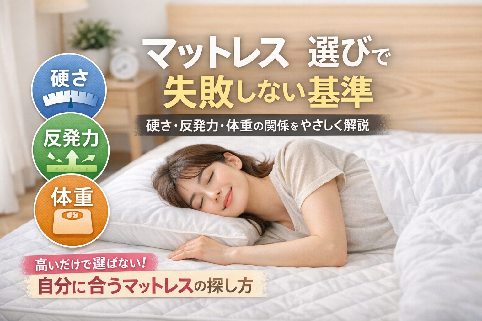 マットレス選びで大切なのは、硬さだけで判断しないこと。体重や反発力、寝姿勢とのバランスを見ながら選ぶことが大事です。