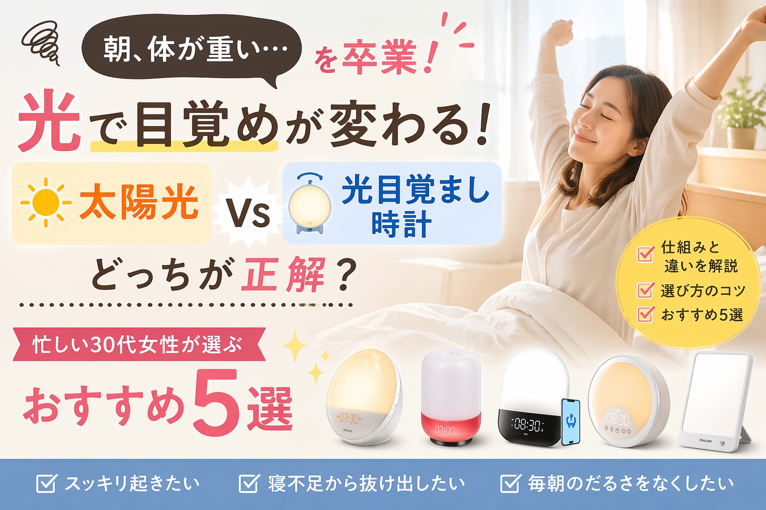 「買ったのに全然起きられない…」なんて悲しいことにならないよう、この3点はしっかりチェックしておきましょう!